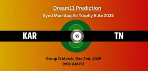 Dream 11 PredictionKAR vs TN Dream11 Prediction Today Group D Match: Fantasy Cricket Tips, Captain & Vice-Captain Choices, Playing XI – Syed Mushtaq Ali Trophy Elite 2025December 2, 2025