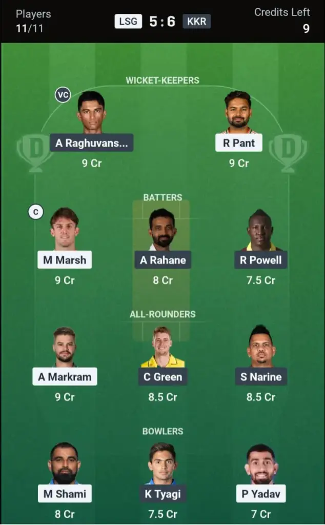 LSG VS KKR Dream11 Prediction Grand League Team: