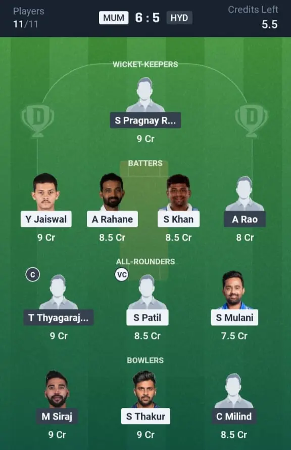 MUM VS HYD Captain and Vice-captain Choices Grand League: