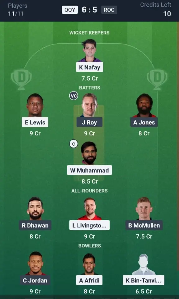 QQY VS ROC Dream11 Prediction Grand League Team:
